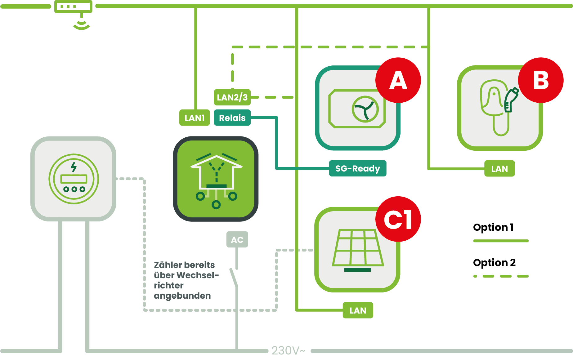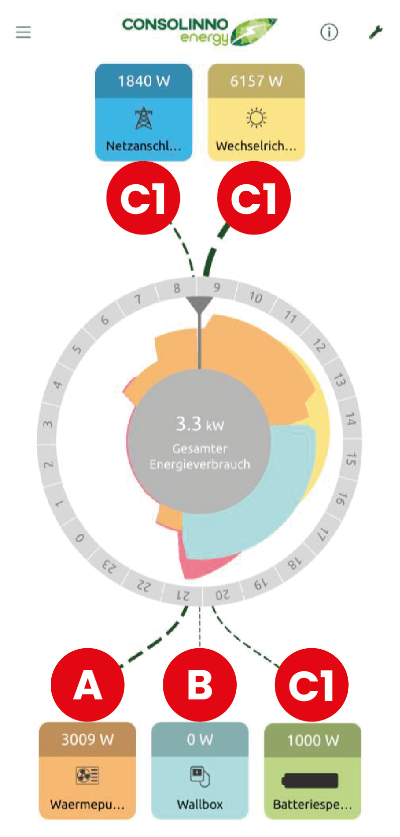 C1 stellt Werte für Netzanschluss, PV Erzeugung und Batteriespeicherzustand bereit